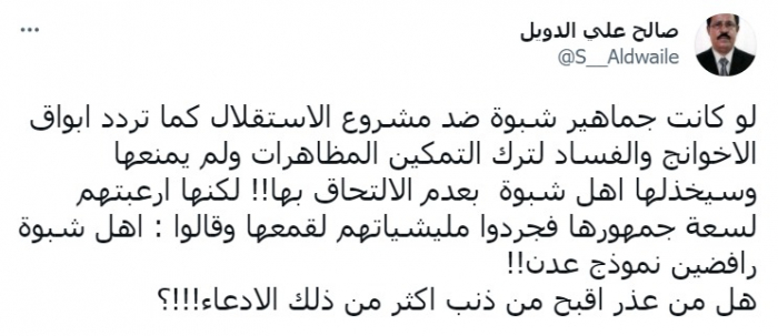 وأكد في تغريدة على تويتر، اليوم الخميس، أنه: "لو كانت جماهير شبوة ضد مشروع الاستقلال كما تردد أبواق الإخوانج والفساد لترك التمكين المظاهرات ولم يمنعها وسيخذلها أهل شبوة بعدم الالتحاق بها!!".