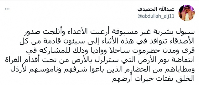 وأكد في تغريدة على تويتر، اليوم الخميس، أن هناك: "سيول بشرية غير مسبوقة أرعبت الأعداء وأثلجت صدور الأصدقاء تتوافد في هذه الأثناء إلى سيئون قادمة من كل قرى ومدن حضرموت ساحلًا وواديًا".