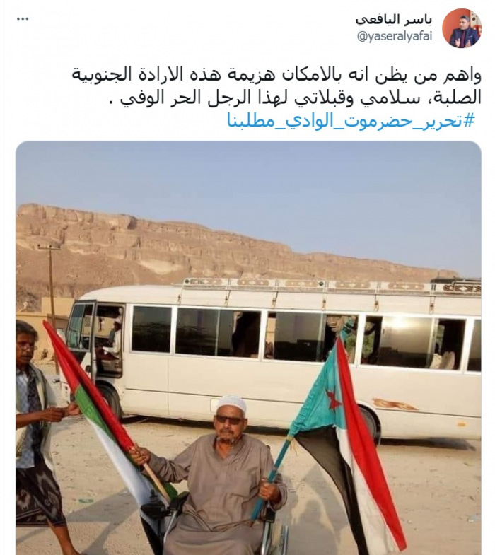 وأشار إلى صورة مسن بين حشود المتظاهرين، قائلا: "سلامي وقبلاتي لهذا الرجل الحر الوفي"، مختتما بهاشتاج: "تحرير حضرموت الوادي مطلبنا".