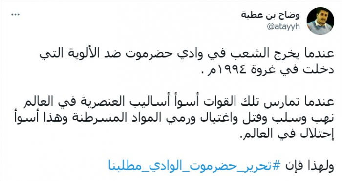 وأشار في تغريدة على تويتر، اليوم الخميس، إلى أنه: "عندما يخرج الشعب في وادي حضرموت ضد الألوية التي دخلت في غزوه 1944م، عندما تمارس تلك القوات أسوأ أساليب العنصرية في العالم نهب وسلب وقتل واغتيال ورمي المواد المسرطنة"، مضيفا أن: "هذا أسوأ احتلال في العالم، ولهذا فإن تحرير حضرموت الوادي مطلبنا".