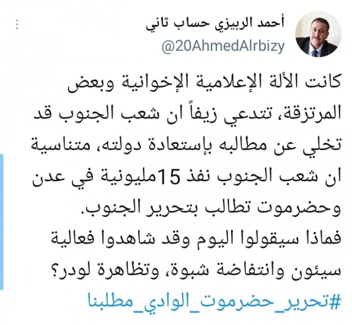 وأكد أنها: "متناسية أن شعب الجنوب نفذ 15 مليونية في عدن وحضرموت تطالب بتحرير الجنوب".