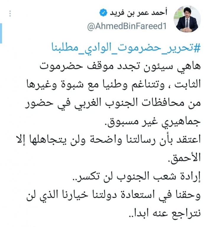 وقال في تغريدة على حسابه بموقع التدوين المصغر تويتر، اليوم إن: "تحرير حضرموت الوادي مطلبنا".