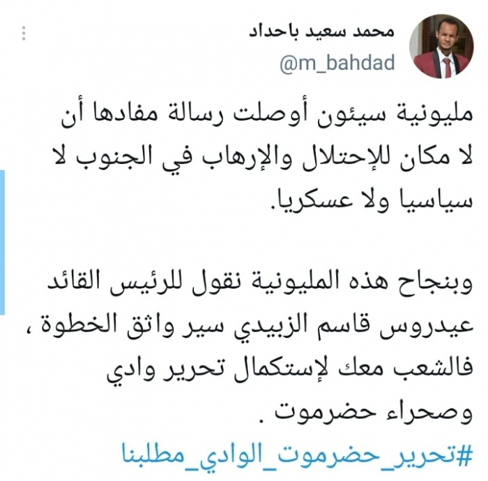 وقال في تغريدة على حسابه بموقع التدوين المصغر تويتر، اليوم إن: "مليونية سيئون أوصلت رسالة مفادها أنه لا مكان للاحتلال والإرهاب في الجنوب لا سياسيا ولا عسكريا".
