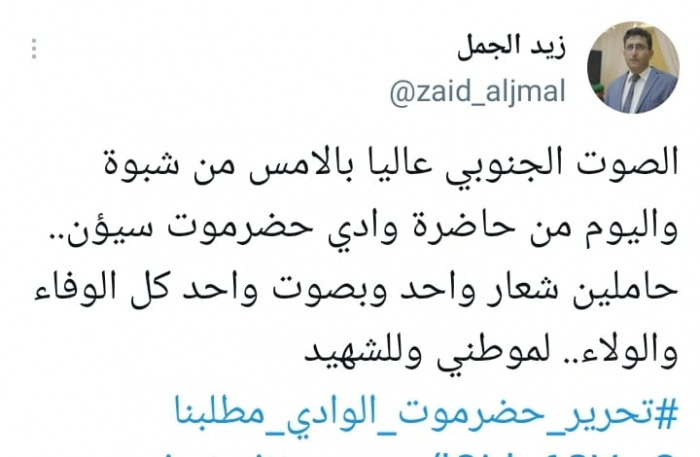 وقال في تغريدة على حسابه بموقع التدوين المصغر تويتر، اليوم إن: "الصوت الجنوبي عاليا بالأمس من شبوة واليوم من حاضرة وادي حضرموت سيؤن".