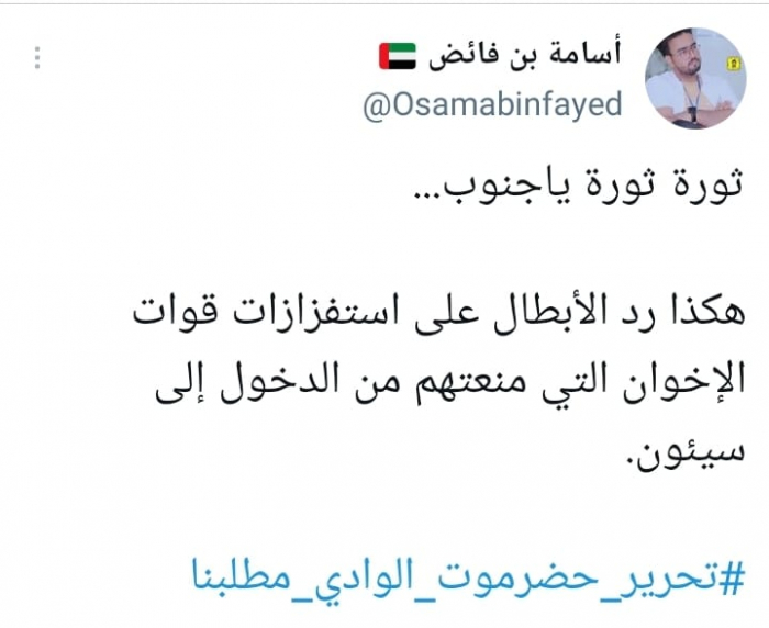 وقال في تغريدة على حسابه بموقع التدوين المصغر تويتر، اليوم: "ثورة ثورة ياجنوب... هكذا رد الأبطال على استفزازات قوات الإخوان التي منعتهم من الدخول إلى سيئون"، مختتما بهاشتاج: "تحرير حضرموت الوادي مطلبنا".