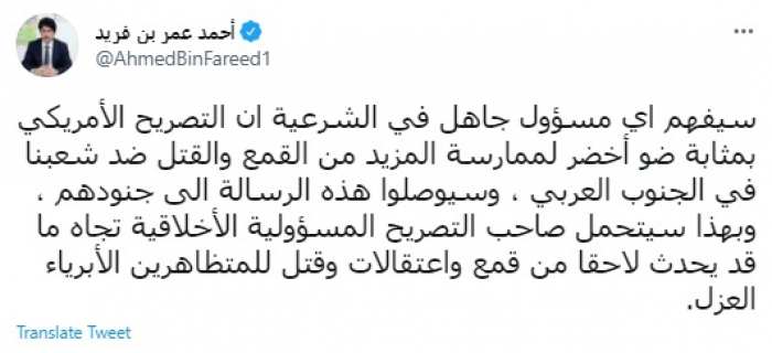 وقال في تغريدة عبر "تويتر" رصدها "المشهد العربي": "سيفهم أي مسؤول جاهل في الشرعية أن التصريح الأمريكي بمثابة ضو أخضر لممارسة المزيد من القمع والقتل ضد شعبنا في الجنوب العربي، وسيوصلوا هذه الرسالة الى جنودهم".