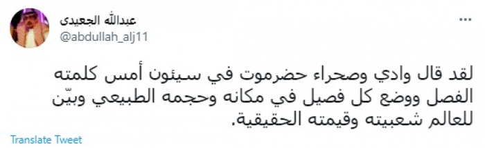وقال في تغريدة عبر "تويتر" رصدها "المشهد العربي": "لقد قال وادي وصحراء حضرموت في سيئون أمس كلمته الفصل ووضع كل فصيل في مكانه وحجمه الطبيعي وبيّن للعالم شعبيته وقيمته الحقيقية".