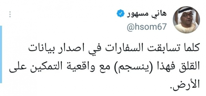 وأكد في تغريدة على حسابه بموقع التدوين المصغر تويتر، اليوم أنه: "كلما تسابقت السفارات في إصدار بيانات القلق فهذا (ينسجم) مع واقعية التمكين على الأرض".