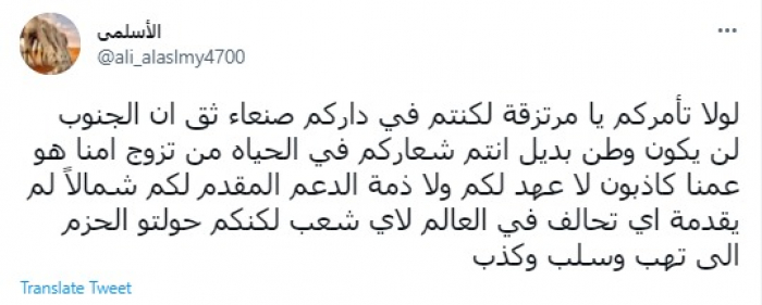 وقال في تغريدة عبر "تويتر" رصدها "المشهد العربي": "لولا تأمركم يا مرتزقة لكنتم في داركم صنعاء ثق أن الجنوب لن يكون وطنًا بديلًا".