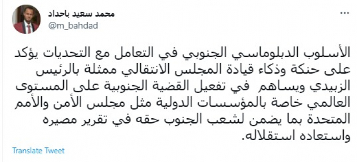وقال في تغريدة عبر "تويتر" رصدها "المشهد العربي": "الأسلوب الدبلوماسي الجنوبي في التعامل مع التحديات يؤكد على حنكة وذكاء قيادة المجلس الانتقالي ممثلة بالرئيس الزُبيدي".