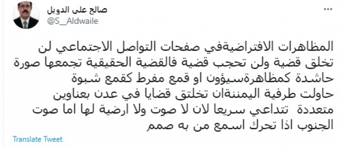 وقال في تغريدة عبر "تويتر" رصدها "المشهد العربي": "المظاهرات الافتراضية في صفحات التواصل الاجتماعي لن تخلق قضية ولن تحجب قضية فالقضية الحقيقية تجمعها صورة حاشدة كمظاهرة سيئون أو قمع مفرط كقمع شبوة".