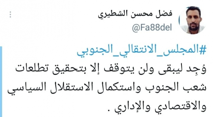 وأشار في تغريدة على حسابه بموقع التدوين المصغر تويتر، اليوم إلى أن: " المجلس الانتقالي الجنوبي وُجِد ليبقى ولن يتوقف إلا بتحقيق تطلعات شعب الجنوب واستكمال الاستقلال السياسي والاقتصادي والإداري".