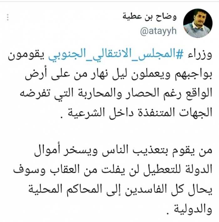 وشدد في تغريدة على حسابه بموقع التدوين المصغر تويتر، اليوم على أن: "وزراء المجلس الانتقالي الجنوبي يقومون بواجبهم ويعملون ليل نهار من على أرض الواقع رغم الحصار والمحاربة التي تفرضها الجهات المتنفذة داخل الشرعية".