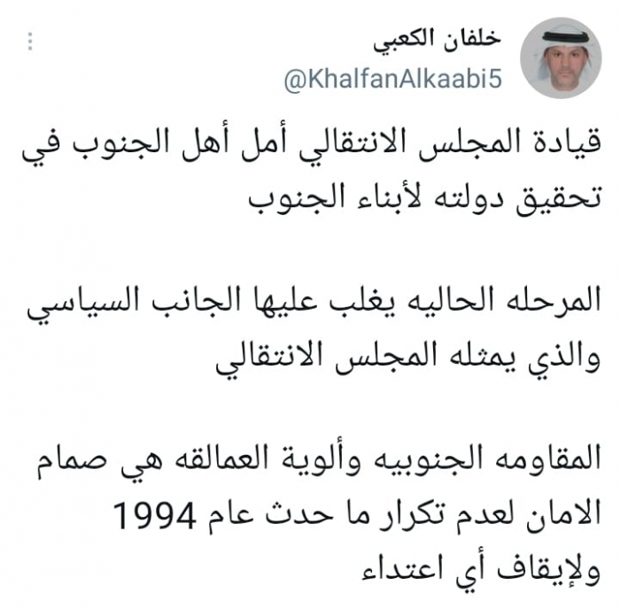 وأكد في تغريدة على حسابه بموقع التدوين المصغر تويتر، اليوم أن: "قيادة المجلس الانتقالي أمل أهل الجنوب في تحقيق دولتهم".