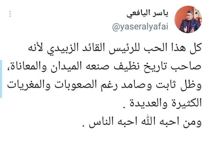 وقال في تغريدة على حسابه بموقع التدوين المصغر تويتر، اليوم إن: "كل هذا الحب للرئيس القائد الزُبيدي لأنه صاحب تاريخ نظيف صنعه الميدان والمعاناة".