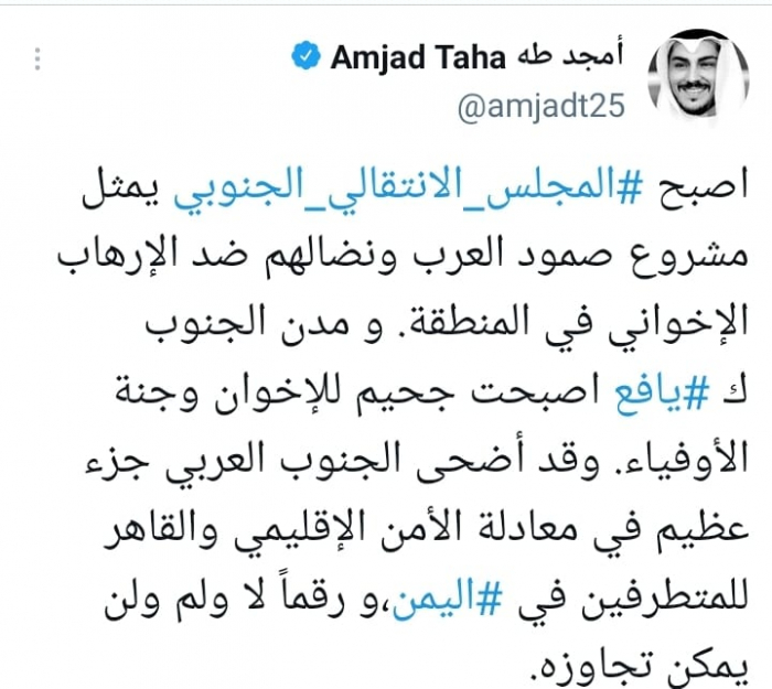 وأكد في تغريدة على حسابه بموقع التدوين المصغر تويتر، اليوم أن: "أصبح المجلس الانتقالي الجنويب يمثل مشروع صمود العرب ونضالهم ضد الإرهاب الإخواني في المنطقة".