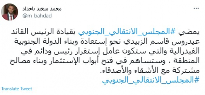 وكتب في تغريدة عبر "تويتر" رصدها "المشهد العربي": "يمضي المجلس الانتقالي الجنوبي بقيادة الرئيس القائد عيدروس قاسم الزُبيدي نحو استعادة وبناء الدولة الجنوبية الفيدرالية والتي ستكون عامل استقرار رئيس ودائم في المنطقة".