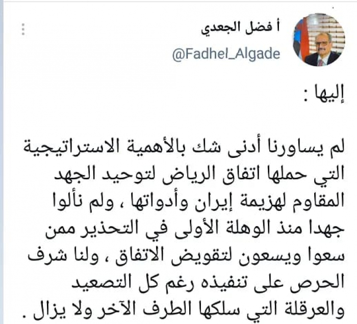 الجعدي: حريصون على تنفيذ اتفاق الرياض رغم تصعيد الشرعية