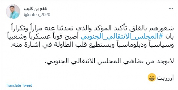 وكتب في تغريدة عبر "تويتر" رصدها "المشهد العربي": "شعورهم بالقلق تأكيد المؤكد والذي تحدثنا عنه مرارًا وتكرارًا بأن المجلس الانتقالي الجنوبي أصبح قويًا عسكريًا وشعبيًا وسياسيًا ودبلوماسيًا ويستطيع قلب الطاولة في إشارة منه".
