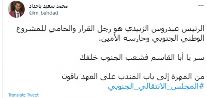 وكتب في تغريدة عبر "تويتر" رصدها "المشهد العربي": "الرئيس عيدروس الزُبيدي هو رجل القرار والحامي للمشروع الوطني الجنوبي وحارسه الأمين".