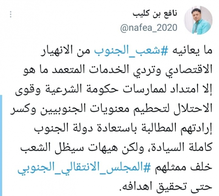وكشف في تغريدة على حسابه بموقع التدوين المصغر تويتر، اليوم أن: "ما يعانيه شعب الجنوب من الانهيار الاقتصادي وتردي الخدمات المتعمد ما هو إلا امتداد لممارسات حكومة الشرعية وقوى الاحتلال".
