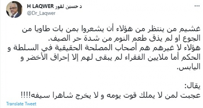 وقال في تغريدة عبر "تويتر" رصدها "المشهد العربي": "غشيم من ينتظر من هؤلاء أن يشعروا بمن بات طاويا من الجوع أو لم يذق طعم النوم من شدة حر الصيف".