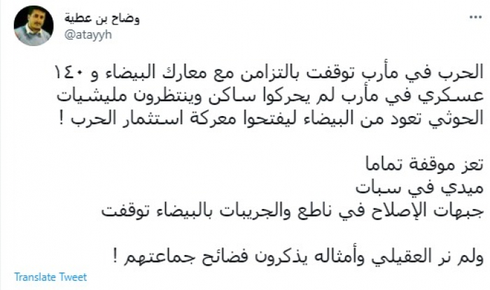 وقال في تغريدة عبر "تويتر" رصدها "المشهد العربي": "الحرب في مأرب توقفت بالتزامن مع معارك البيضاء و 140 عسكري في مأرب لم يحركوا ساكن وينتظرون مليشيات الحوثي تعود من البيضاء ليفتحوا معركة استثمار الحرب".