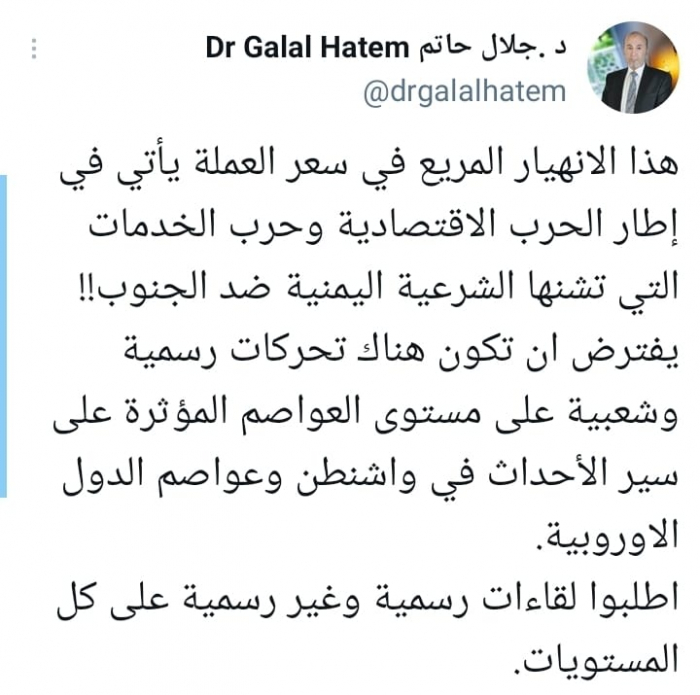 وحذر في تغريدة على حسابه بموقع التدوين المصغر تويتر، اليوم من أن: "هذا الانهيار المريع في سعر العملة يأتي في إطار الحرب الاقتصادية وحرب الخدمات التي تشنها الشرعية اليمنية ضد الجنوب!!".