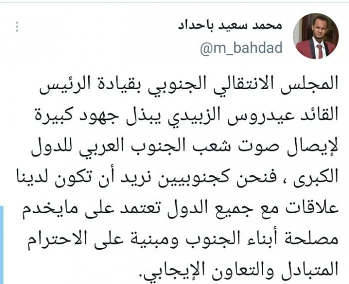 وشدد في تغريدة على حسابه بموقع التدوين المصغر تويتر، اليوم على أن: "المجلس الانتقالي الجنوبي بقيادة الرئيس القائد عيدروس الزبيدي يبذل جهود كبيرة لإيصال صوت شعب الجنوب العربي للدول الكبرى".