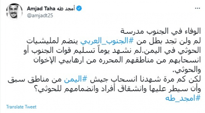 وقال في تغريدة عبر "تويتر" رصدها "المشهد العربي": "الوفاء في الجنوب مدرسة لم ولن تجد بطل من الجنوب العربي ينضم لمليشيات الحوثي في اليمن".