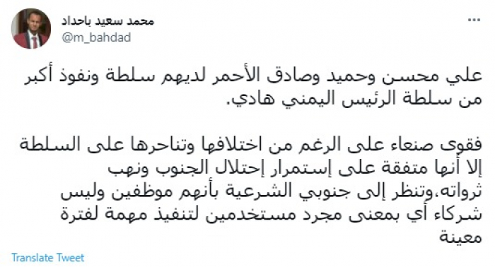 وكتب في تغريدة عبر "تويتر" رصدها "المشهد العربي": "علي محسن وحميد وصادق الأحمر لديهم سلطة ونفوذ أكبر من سلطة الرئيس اليمني هادي".