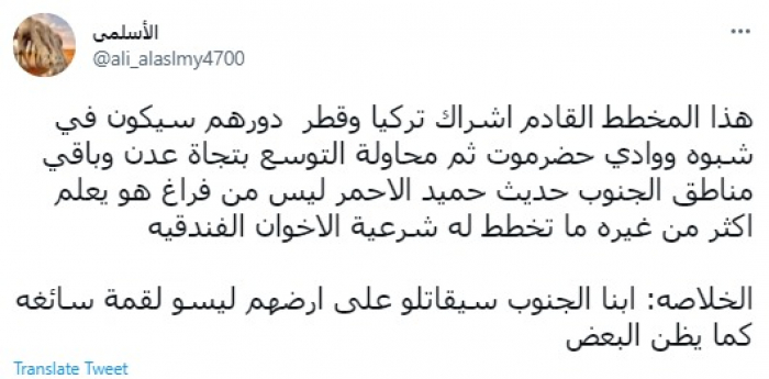 جاء ذلك في مجمل تعليق "الأسلمي" على فيديو للقيادي الإخواني المدعو حميد الأحمر دعا خلاله لإدخال قطر وتركيا في الجنوب بحجة مُساندة الشرعية الإخوانية.