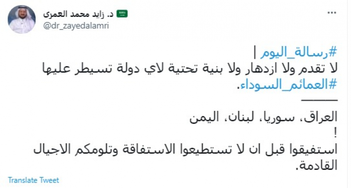 وكتب في تغريدة عبر "تويتر" رصدها "المشهد العربي": "رسالة اليوم| لا تقدم ولا ازدهار ولا بنية تحتية لأي دولة تسيطر عليها العمائم السوداء. العراق، سوريا، لبنان، اليمن".