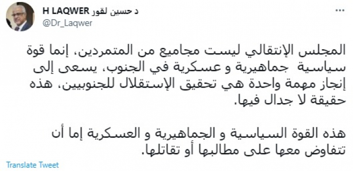وقال في تغريدة عبر "تويتر" رصدها "المشهد العربي": "المجلس الانتقالي ليست مجاميع من المتمردين، إنما قوة سياسية جماهيرية وعسكرية في الجنوب، يسعى إلى إنجاز مهمة واحدة هي تحقيق الاستقلال للجنوبيين، هذه حقيقة لا جدال فيها".