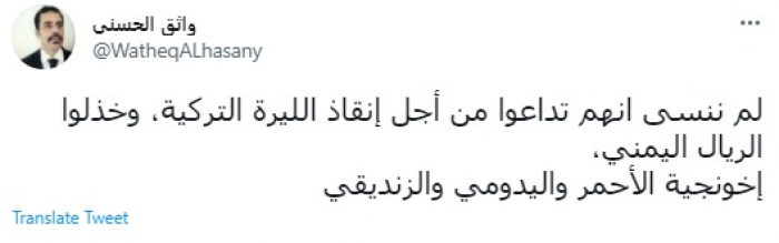 وقال في تغريدة عبر "تويتر" رصدها "المشهد العربي": "لم ننسى أنهم تداعوا من أجل إنقاذ الليرة التركية، وخذلوا الريال اليمني، إخونجية الأحمر واليدومي والزنديقي".