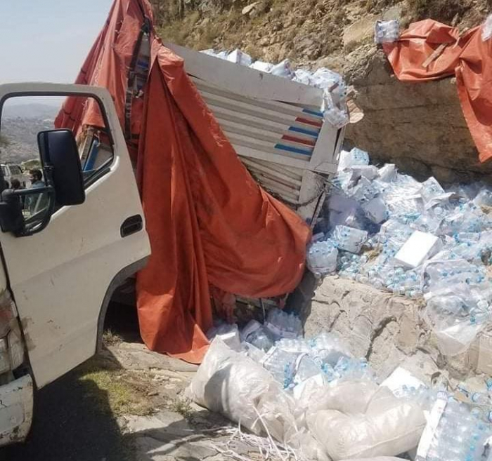 انقلبت شاحنة مُحملة بكميات من المياه المعدنية، اليوم الأربعاء، في منحدر خطر بخط "صنعاء ـ المحويت".