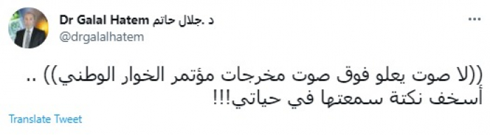 وقال في تغريدة عبر "تويتر" رصدها "المشهد العربي": "لا صوت يعلو فوق صوت مخرجات مؤتمر الخوار الوطني.. أسخف نكتة سمعتها في حياتي".