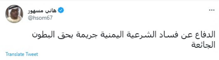 وقال في تغريدة عبر "تويتر" رصدها "المشهد العربي": "الدفاع عن فساد الشرعية اليمنية جريمة بحق البطون الجائعة".