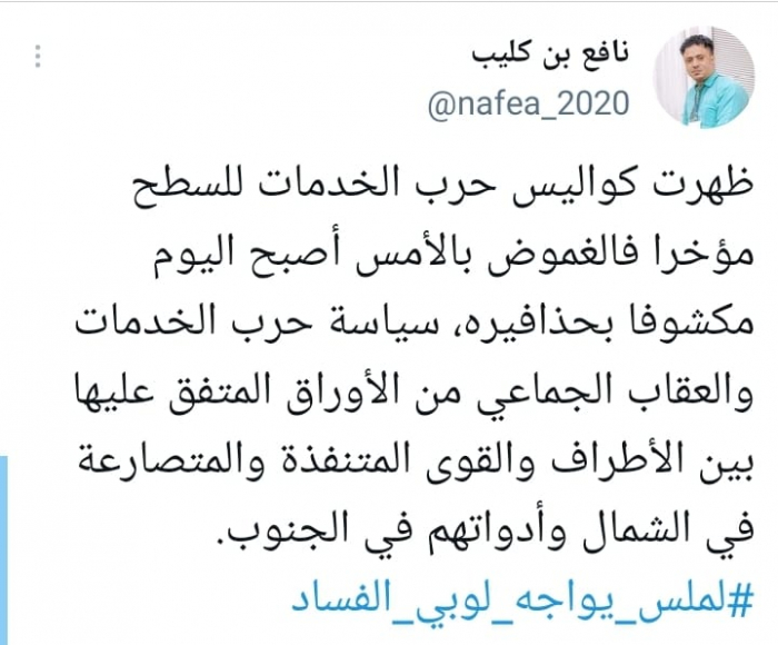 وشدد في تغريدة على حسابه بموقع التدوين المصغر تويتر، اليوم على أنه: "بدأت تطفو على السطح كواليس حرب الخدمات ضد شعب الجنوب، وعندما قام لملس باجتثاث الفساد المنتشر كالسرطان بفعل ممارسات شرعية الإخوان قامت الشرعية بمحاربته، كون الفساد أحد اساسيات بقائها".