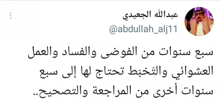 وشدد في تغريدة على حسابه بموقع التدوين المصغر تويتر، اليوم على أن: "سبع سنوات من الفوضى والفساد والعمل العشوائي والتّخبّط تحتاج لها إلى سبع سنوات أخرى من المراجعة والتصحيح".