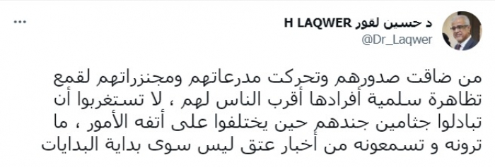 ونوه في تغريدة على تويتر، اليوم بأن: "من ضاقت صدورهم وتحركت مدرعاتهم ومجنزراتهم لقمع تظاهرة سلمية أفرادها أقرب الناس لهم، لا تستغربوا أن تبادلوا جثامين جندهم حين يختلفوا على أتفه الأمور".