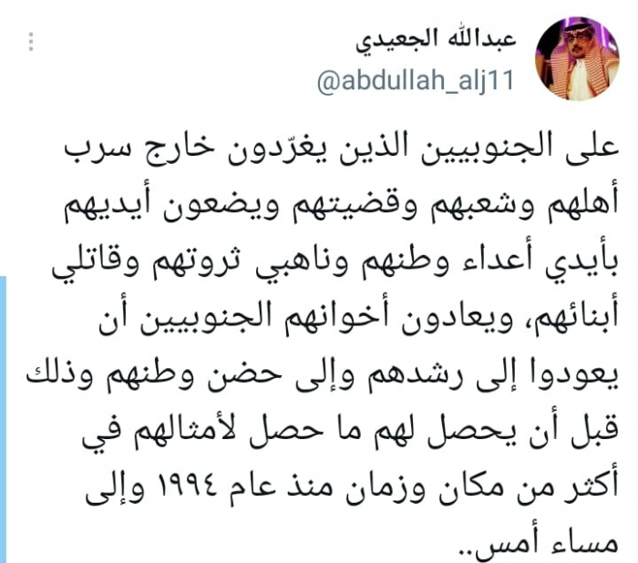وقال في تغريدة على حسابه بموقع التدوين المصغر تويتر، اليوم إنه: "على الجنوبيين الذين يغرّدون خارج سرب أهلهم وشعبهم وقضيتهم ويضعون أيديهم بأيدي أعداء وطنهم وناهبي ثروتهم وقاتلي أبنائهم، ويعادون أخوانهم الجنوبيين أن يعودوا إلى رشدهم".