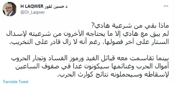 وقال في تغريدة عبر "تويتر" رصدها "المشهد العربي": "ماذا بقي من شرعية هادي؟ لم يبق مع هادي إلا ما يحتاجه الآخرون من شرعيته لإسدال الستار على آخر فصولها، رغم أنه لا زال قادر على التخريب".