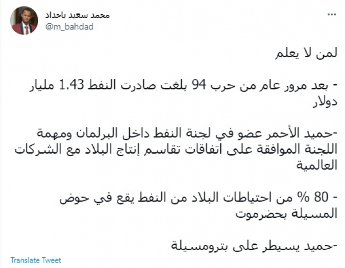 وتابع: "80 % من احتياطات البلاد من النفط يقع في حوض المسيلة بحضرموت - حميد يسيطر على بترومسيلة".