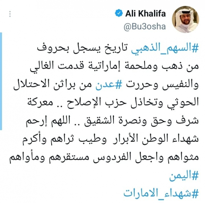 ولفت في تغريدة على حسابه بموقع التدوين المصغر تويتر، اليوم إلى أن: "السهم الذهبي تاريخ يسجل بحروف من ذهب وملحمة إماراتية قدمت الغالي والنفيس وحررت عدن من براثن الاحتلال الحوثي وتخاذل حزب الإصلاح".