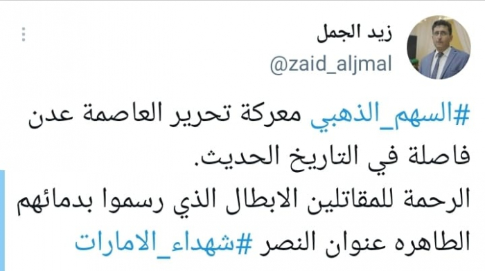 عبر زيد الجمل السكرتير الصحفي لرئيس المجلس الانتقالي الجنوبي، عن اعتزازه بشهداء دولة الإمارات العربية المتحدة في تحرير العاصمة عدن، خلال معركة السهم الذهبي.