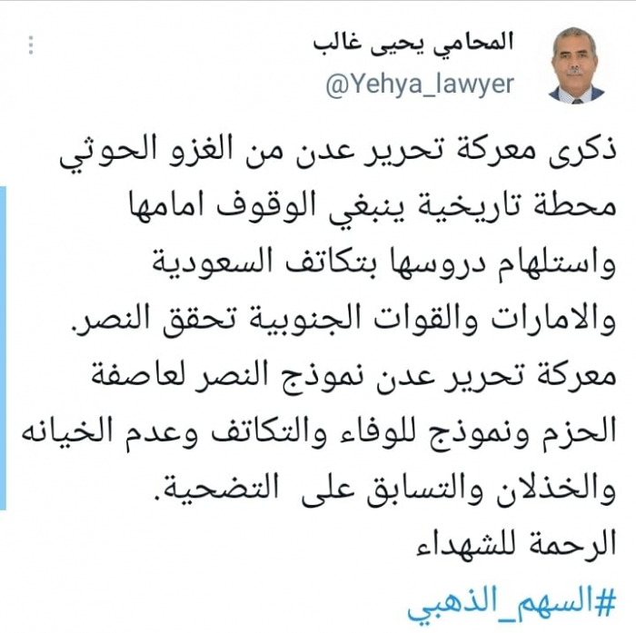 وأضاف أن: "معركة تحرير عدن نموذج النصر لعاصفة الحزم ونموذج للوفاء والتكاتف وعدم الخيانه والخذلان والتسابق على التضحية"، متابعا: "الرحمة للشهداء السهم الذهبي".