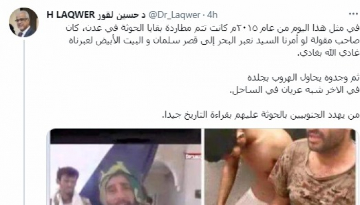 وقال في تغريدة عبر "تويتر" رصدها "المشهد العربي": "في مثل هذا اليوم من عام 2015م كانت تتم مطاردة بقايا الحوثة في عدن، كان صاحب مقولة لو أمرنا السيد نعبر البحر إلى قصر سلمان والبيت الأبيض لعبرناه غادي الله بغادي ثم وجدوه يحاول الهروب بجلده في الآخر شبه عريان في الساحل".