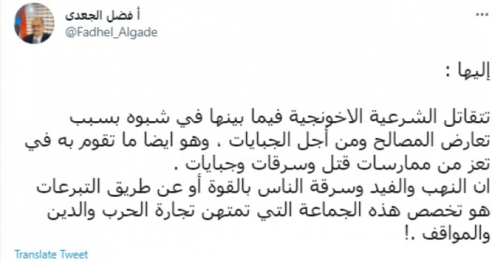 وأضاف: "إن النهب والفيد وسرقة الناس بالقوة أو عن طريق التبرعات هو تخصص هذه الجماعة التي تمتهن تجارة الحرب والدين والمواقف".