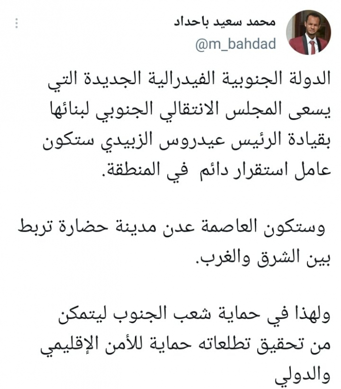 وأشار في تغريدة على حسابه بموقع التدوين المصغر تويتر، اليوم إلى أن: "الدولة الجنوبية الفيدرالية الجديدة التي يسعى المجلس الانتقالي الجنوبي لبنائها بقيادة الرئيس عيدروس الزُبيدي ستكون عامل استقرار دائم في المنطقة".